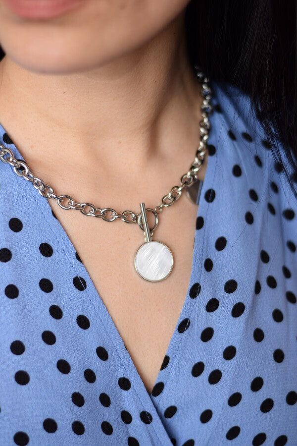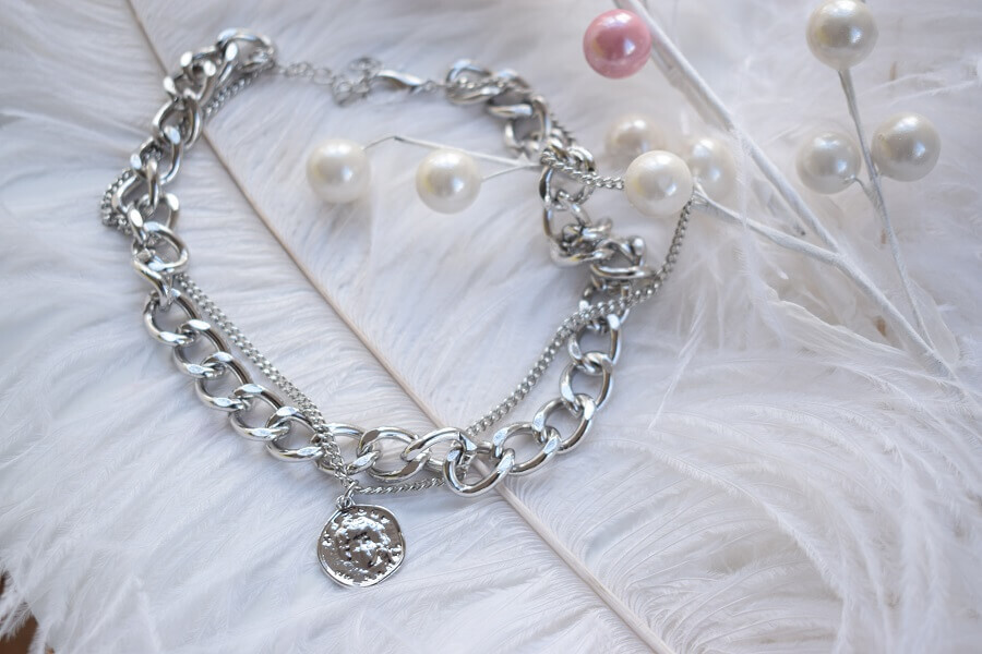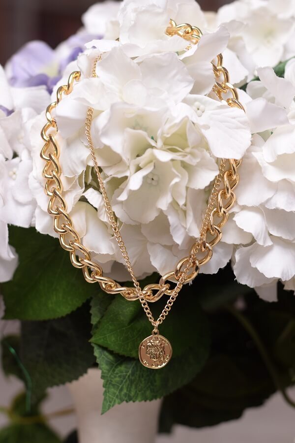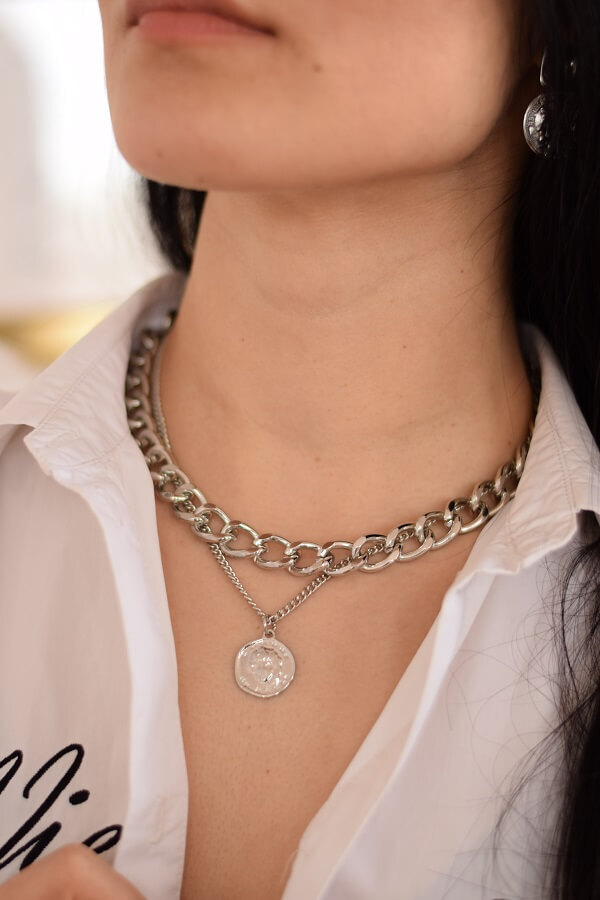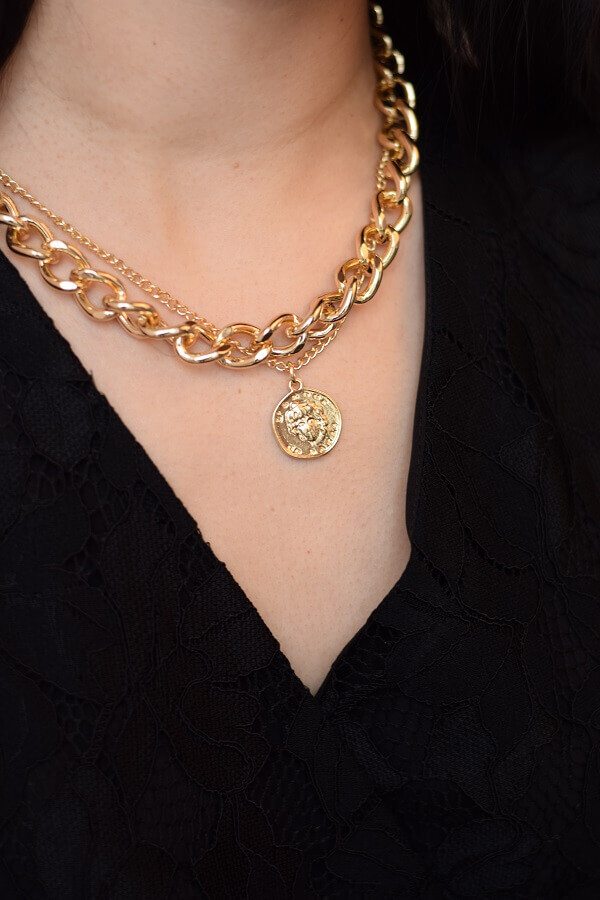 - Двойное колье из толстой цепи и подвеска с кулоном-монетой – длина от 37 до 44 см