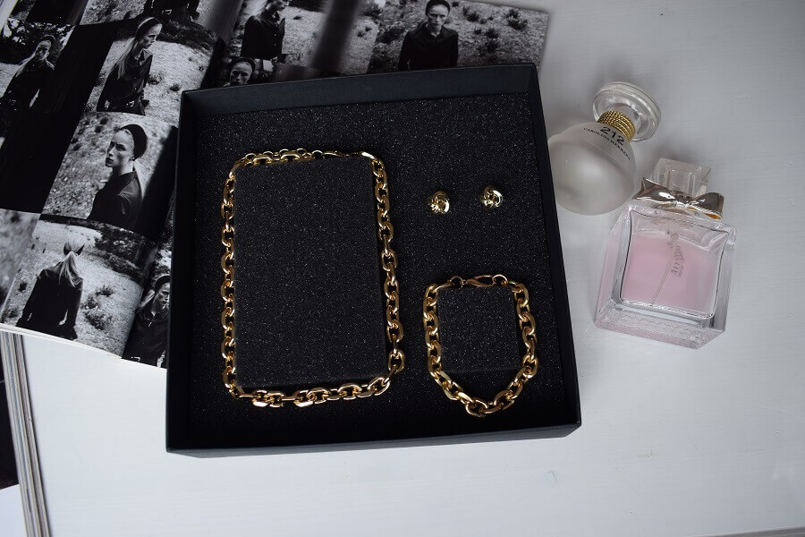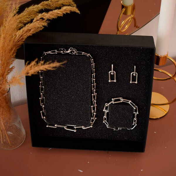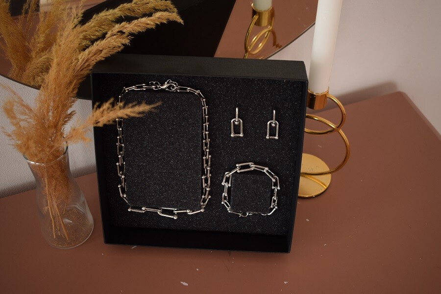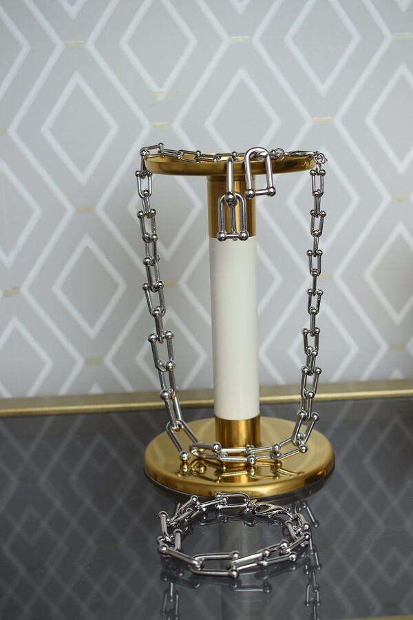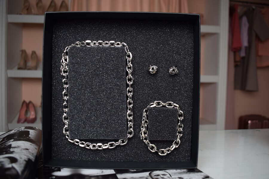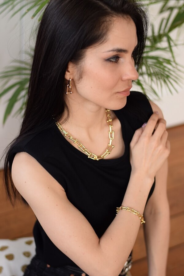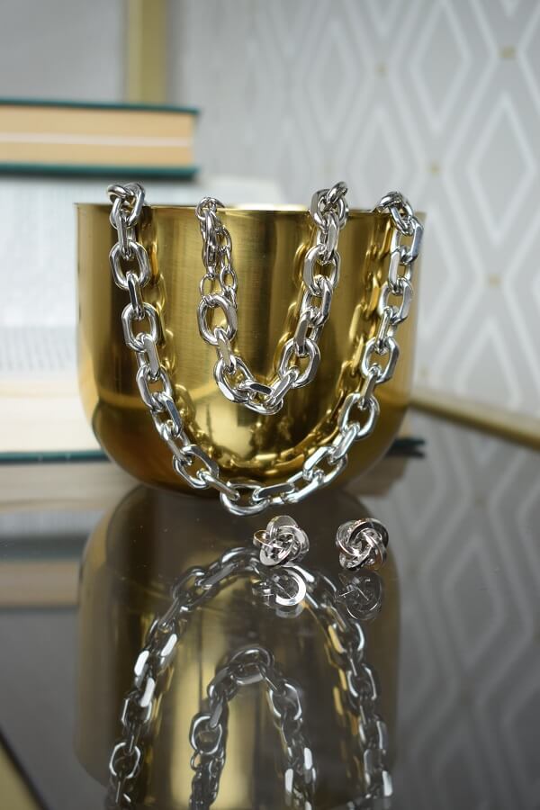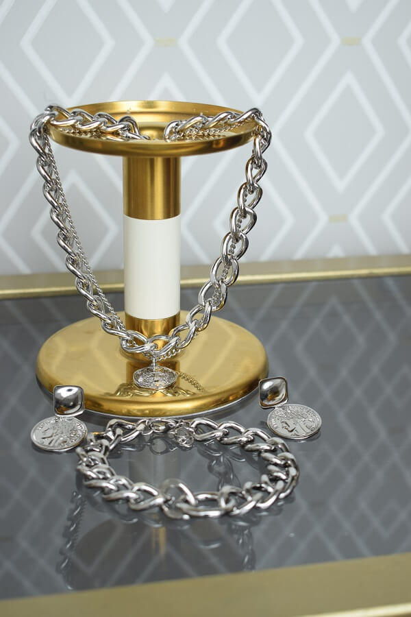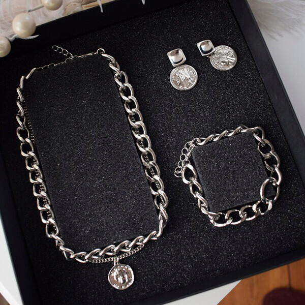 В набор входит крупная геометрическая цепь, браслет и серьги-трансформеры. Этот образ уверенно подчеркнёт ваши острые черты лица и добавит дерзости.
