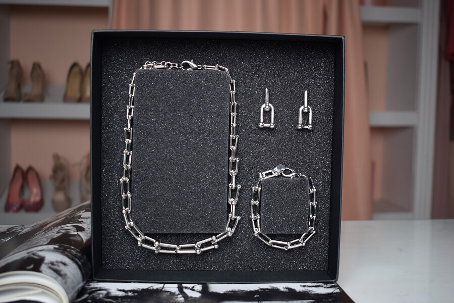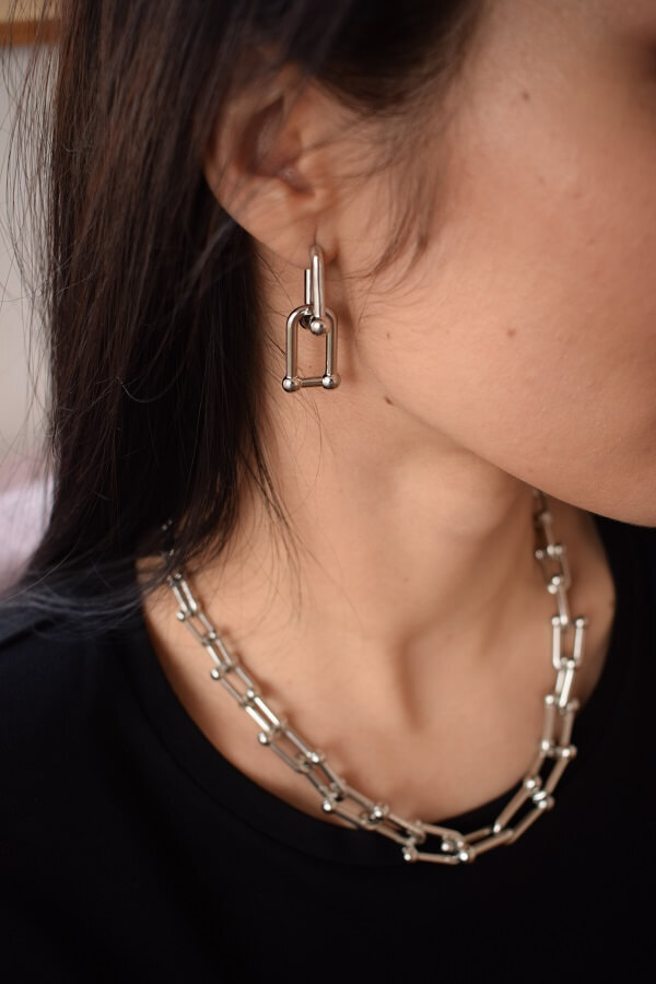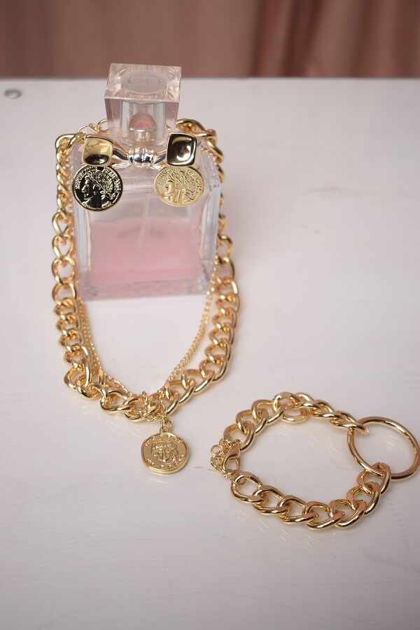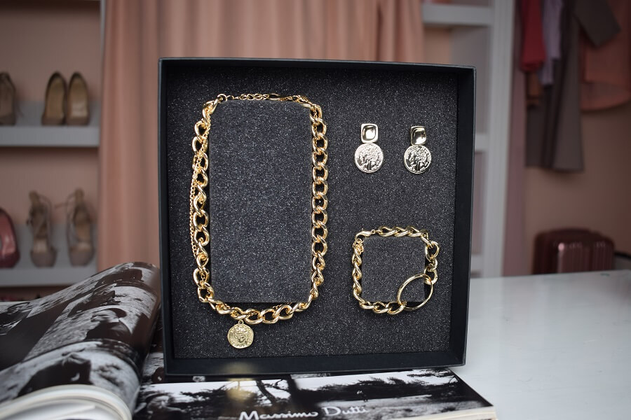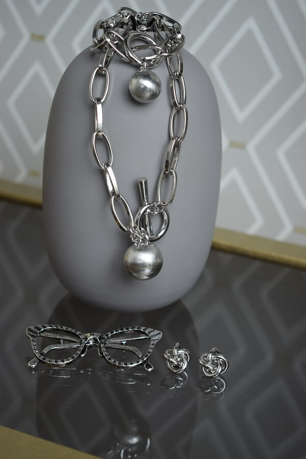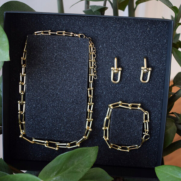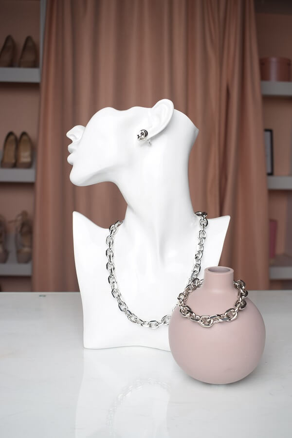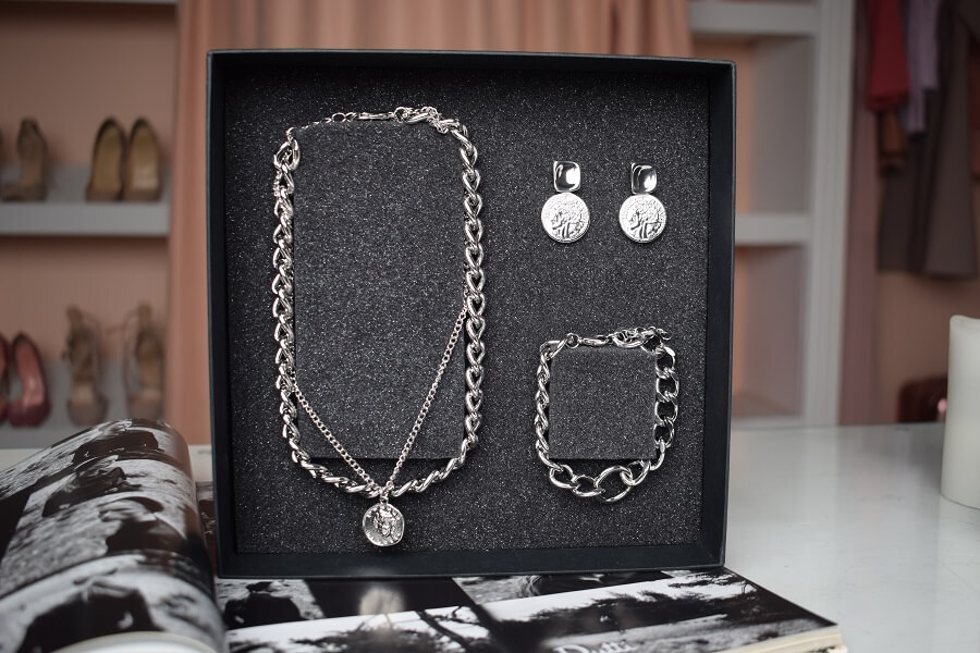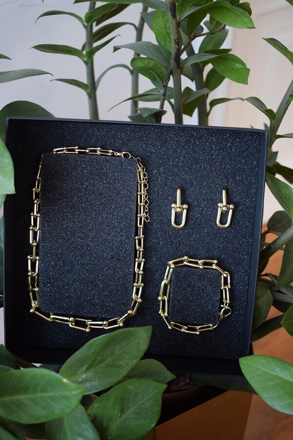 В набор входит крупная геометрическая цепь, браслет и серьги-трансформеры. Этот образ уверенно подчеркнёт ваши острые черты лица и добавит дерзости.