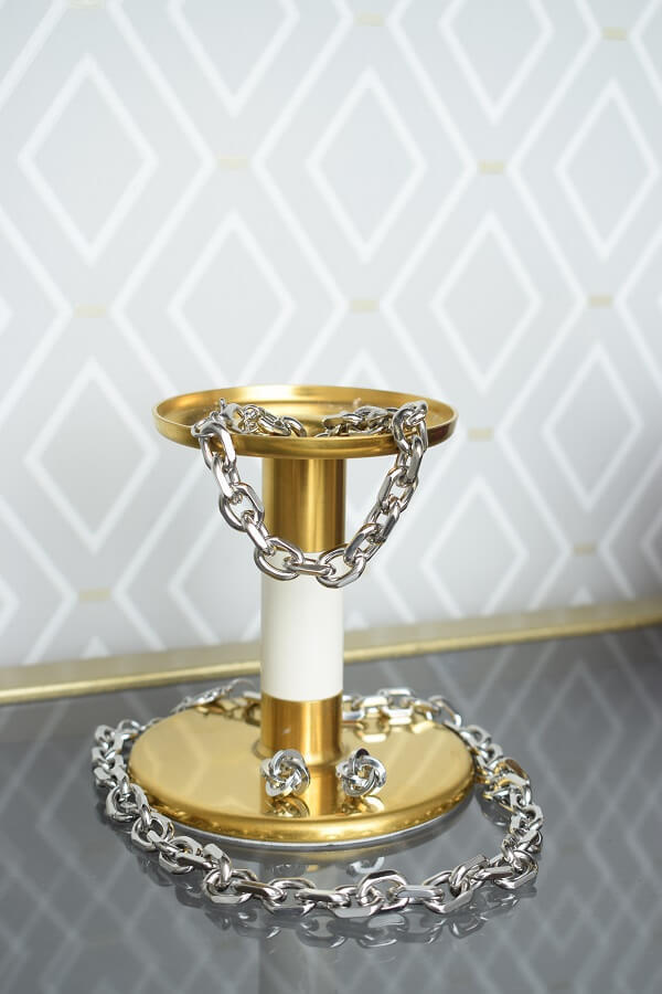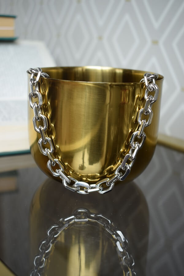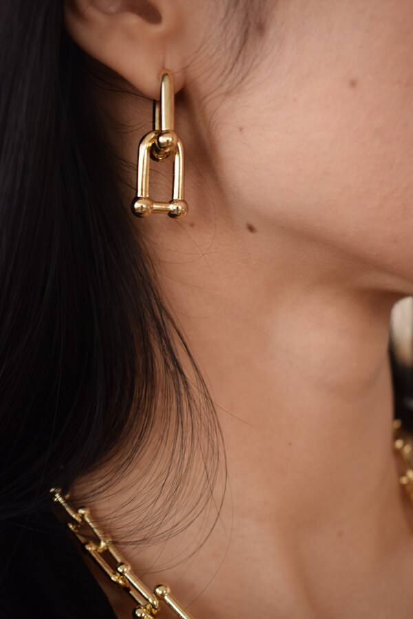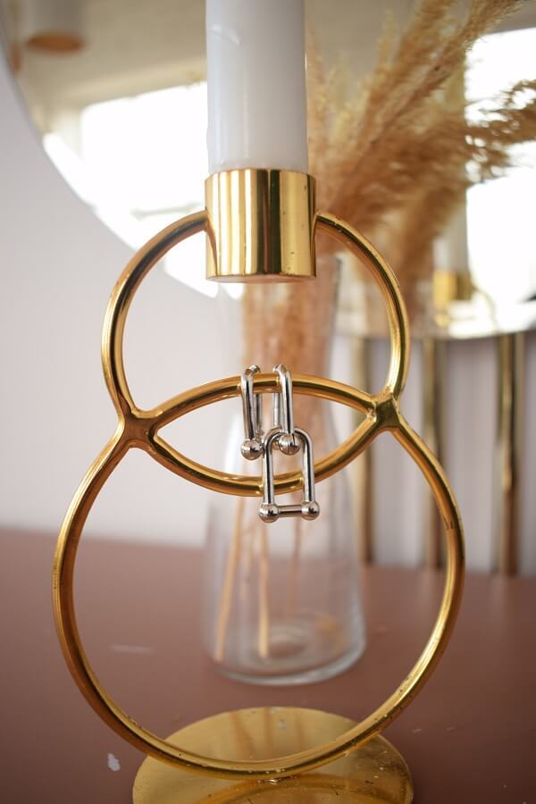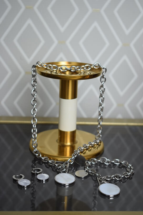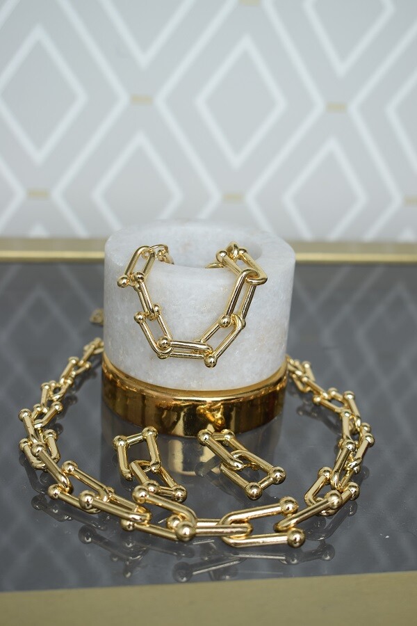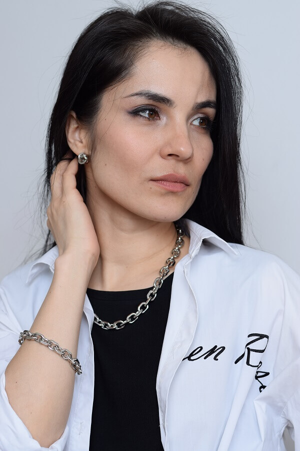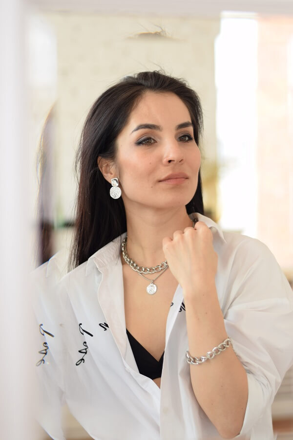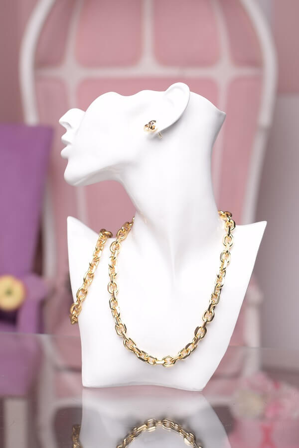 В набор входит крупная геометрическая цепь, браслет и серьги-трансформеры. Этот образ уверенно подчеркнёт ваши острые черты лица и добавит дерзости.