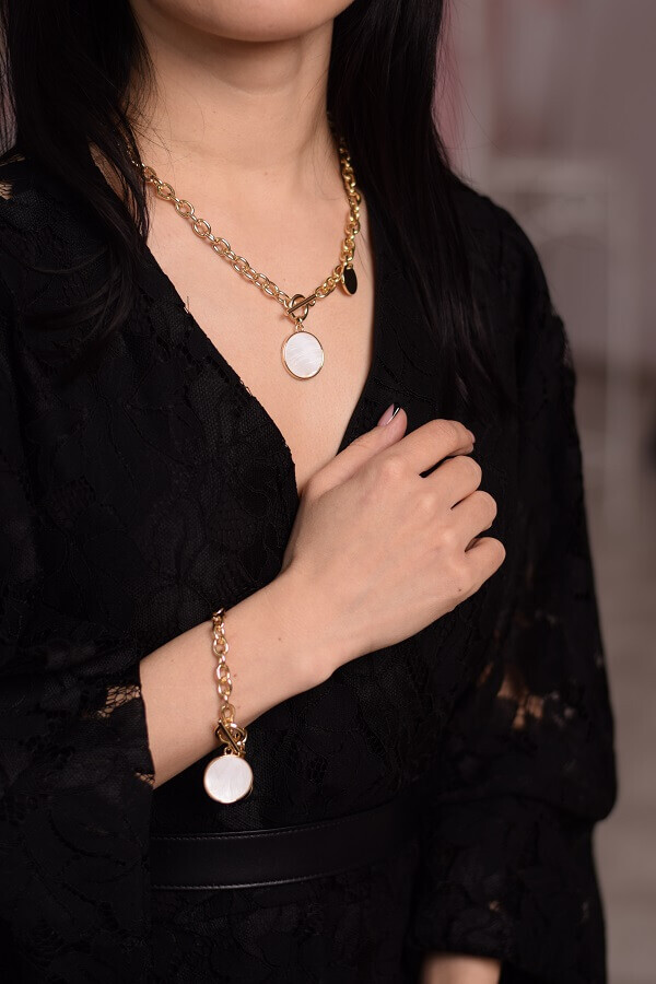 Набор стиля и гармонии праздника - двойное колье из толстой цепи и подвеской с кулоном, браслет с крупными звеньями и серьги с округлой подвеской. Шикарное сочетание классики и стиля эллинизма.